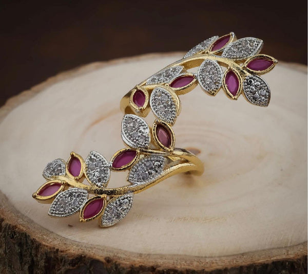 Designed with an intricate double-leaf structure, the ring features alternating ruby-pink enamel stones and shimmering CZ-studded leaves — giving it a rich, high-end designer look.